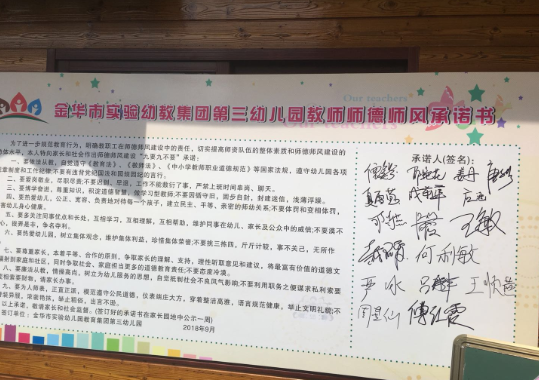 宣誓后,老師們陸續(xù)在師德師風(fēng)承諾書上簽名,立志成為高素質(zhì)、品德優(yōu)的合格教師,牢記誓言、不忘初心,為了共同的幼教事業(yè)奉獻(xiàn)青春和熱情。